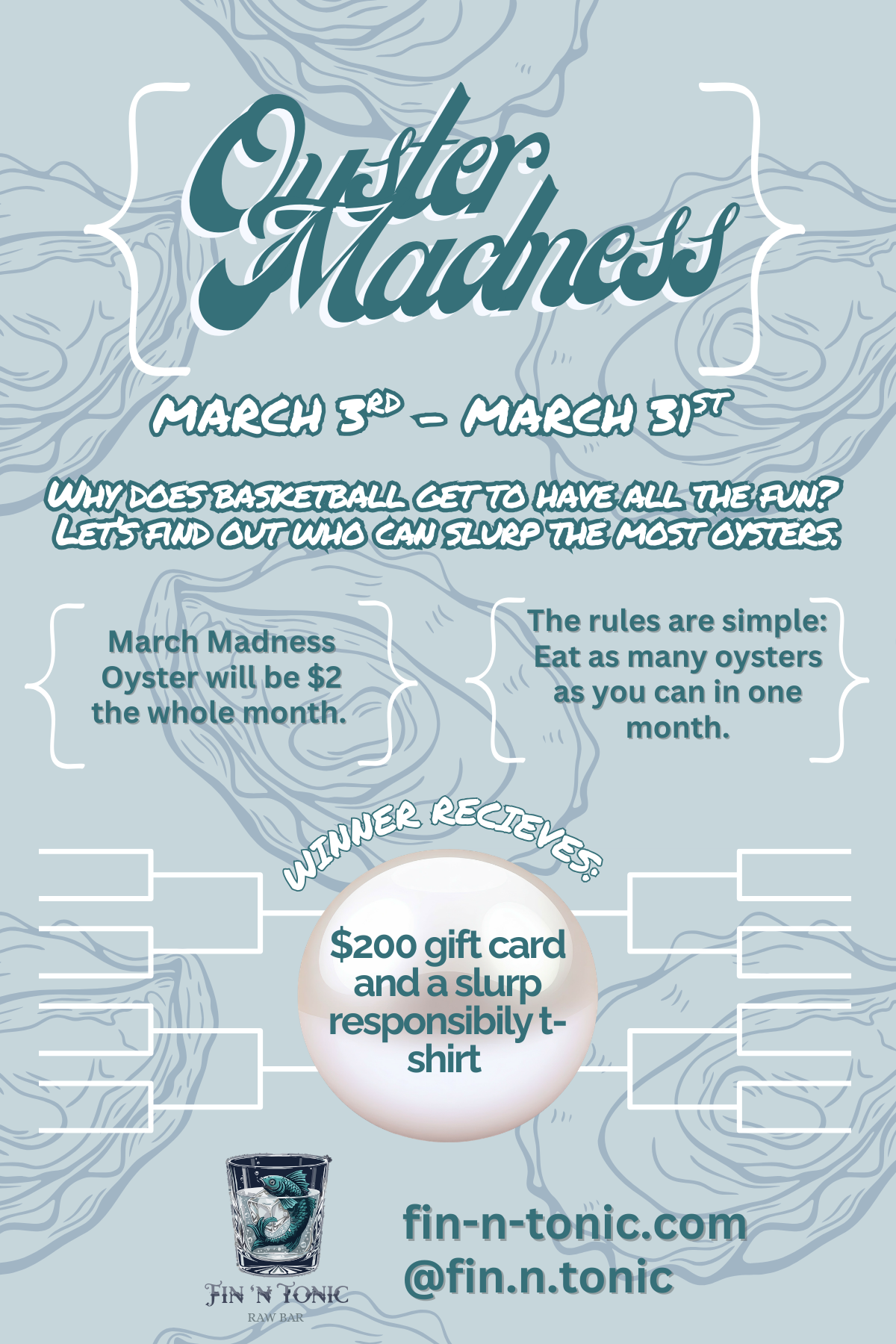 Why does basketball get to have all the fun?? We decided to have a little 'March Madness' of our own! Slurp your way into the bracket by enjoying our $2 Oyster Madness special for the whole month. The Oyster Lover who eats the most oysters this month will receive a $200 restaurant gift card and a ‘slurp responsibly’ t - shirt.
